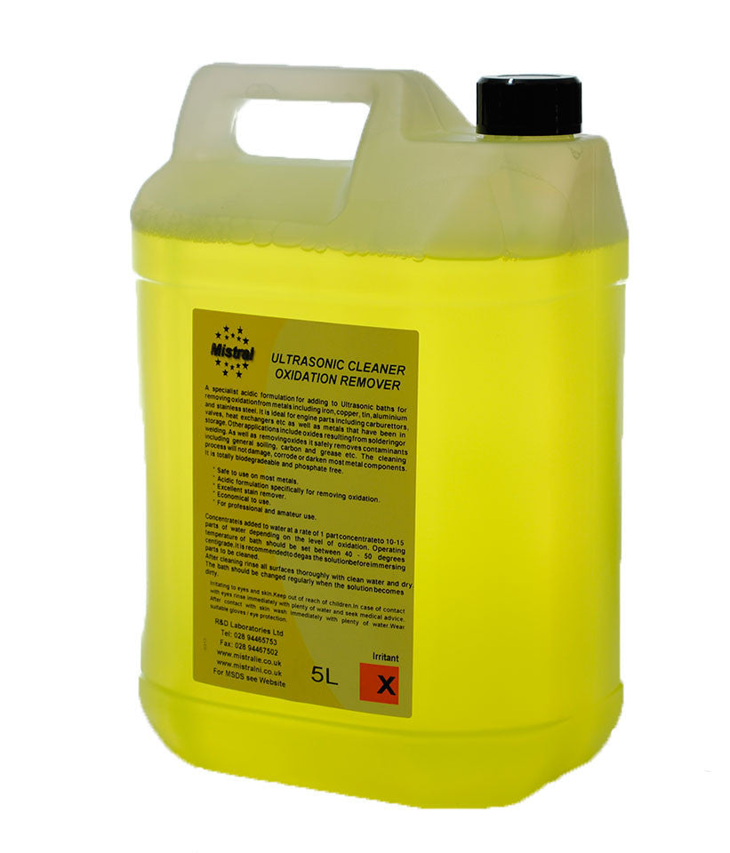 A specialist acicic formulation for adding to Ultrasonic baths for removing oxidation from metals including iron, copper, tin, aluminium and stainless steel. It is ideal for engine parts including carburettors, valves, heat exchangers etc as well as metals that have been in storage. Other applications include oxides resulting from soldering or welding. As well as removing oxides it safely removes contaminants including general soiling, carbon and grease etc. The cleaning process will not damage, corrode or darken most metal components. It is totally biodegradeable and phosphate free.